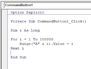 Next I will explain you how to add VBA code to ActiveX control command button. As an example let's write a code to type from 1 to 100,000 in column A of the Excel sheet. First click on the developer tab and select the Design mode.